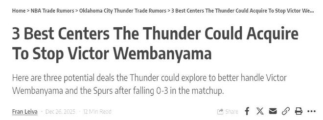 输掉比赛后,俄克拉荷马市当地媒体发文表示,马刺、森林狼已经给我们的卫冕之路敲响警钟,本赛季我们并非无人可挡,在西部除了马刺、森林狼外,雷霆还有掘金、火箭两个强大的对手,所以,我们不能拽着手中的首轮签紧紧不放,在交易截止日前,我们也该防守一博了,内线的补强,已经是刻不容缓的存在,他们列出了3个内线补强人选,其中祖巴茨排在第一个。美媒露天看台也表示,雷霆、快船有望在交易节日前完成一笔重磅交易,最终引进快船的祖巴茨,完成内线的升级。