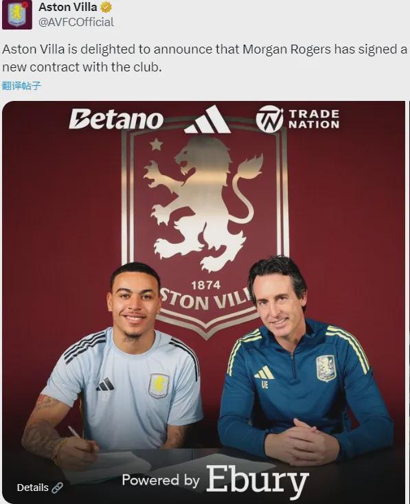 官方:维拉宣布摩根-罗杰斯签下了一份2031年到期的新合同,比原合同延长了一年。