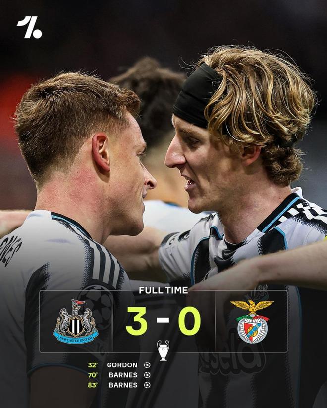 纽卡斯尔主场3-0完胜穆里尼奥率领的本菲卡。安东尼·戈登首开纪录,哈维·巴恩斯一传一射,替补威尔逊锁定胜局。本菲卡欧冠三连败,小组出线形势堪忧。